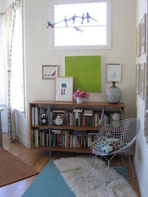 I love this space, but I just have to say that I would for sure replace the chair. The space is warming and welcoming- with all those books to choose from- so I would naturally want to be comfortable sitting in my chair rather than stuck in one position on a wire chair... just my opinion...